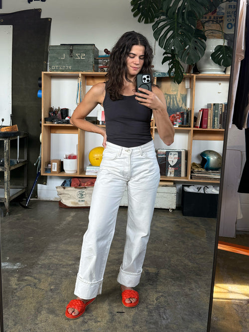 featuring a true mid rise and an easy, open leg, edie is in many ways an unexpected combination for us. the top block is intentionally accommodating, sitting on your hips and effortlessly extending into a full, straight leg.
