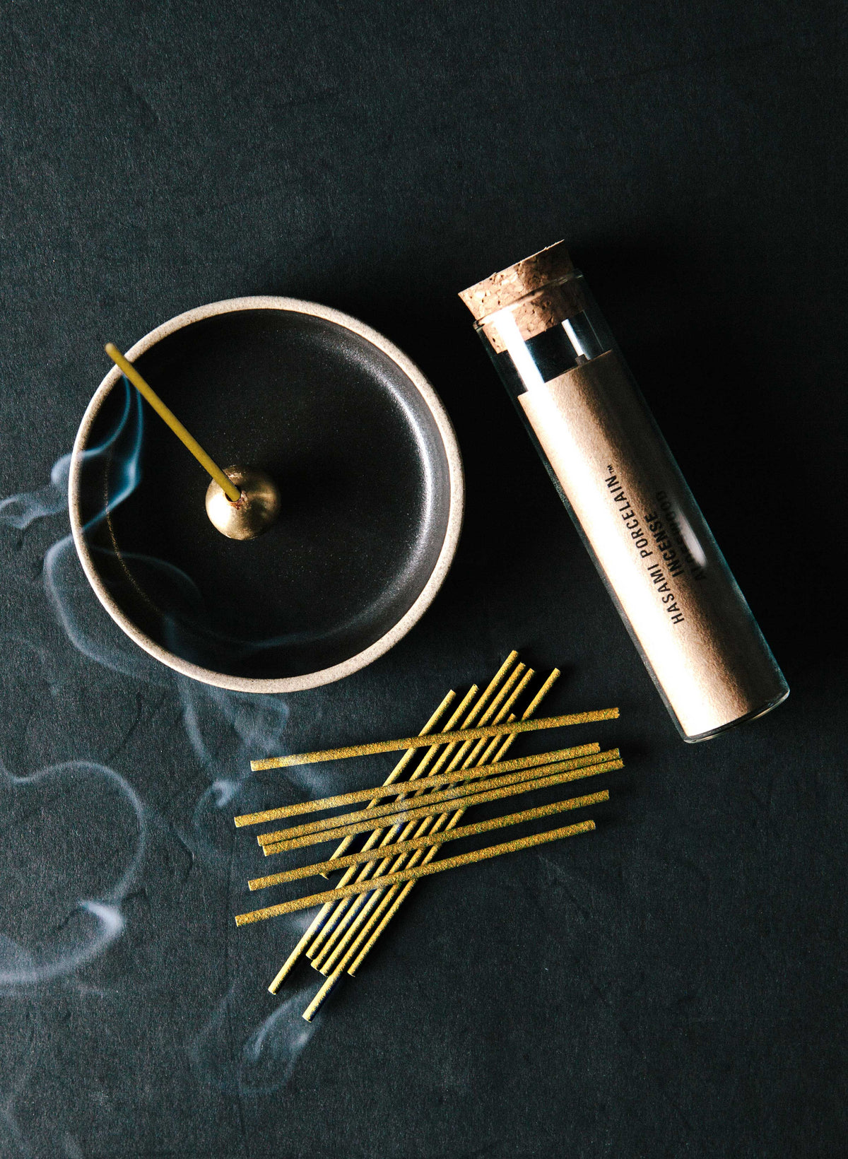 this set comes with a porcelain dish, brass ball incense holder, and sandalwood incense.