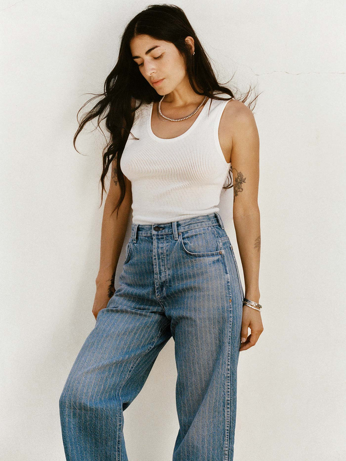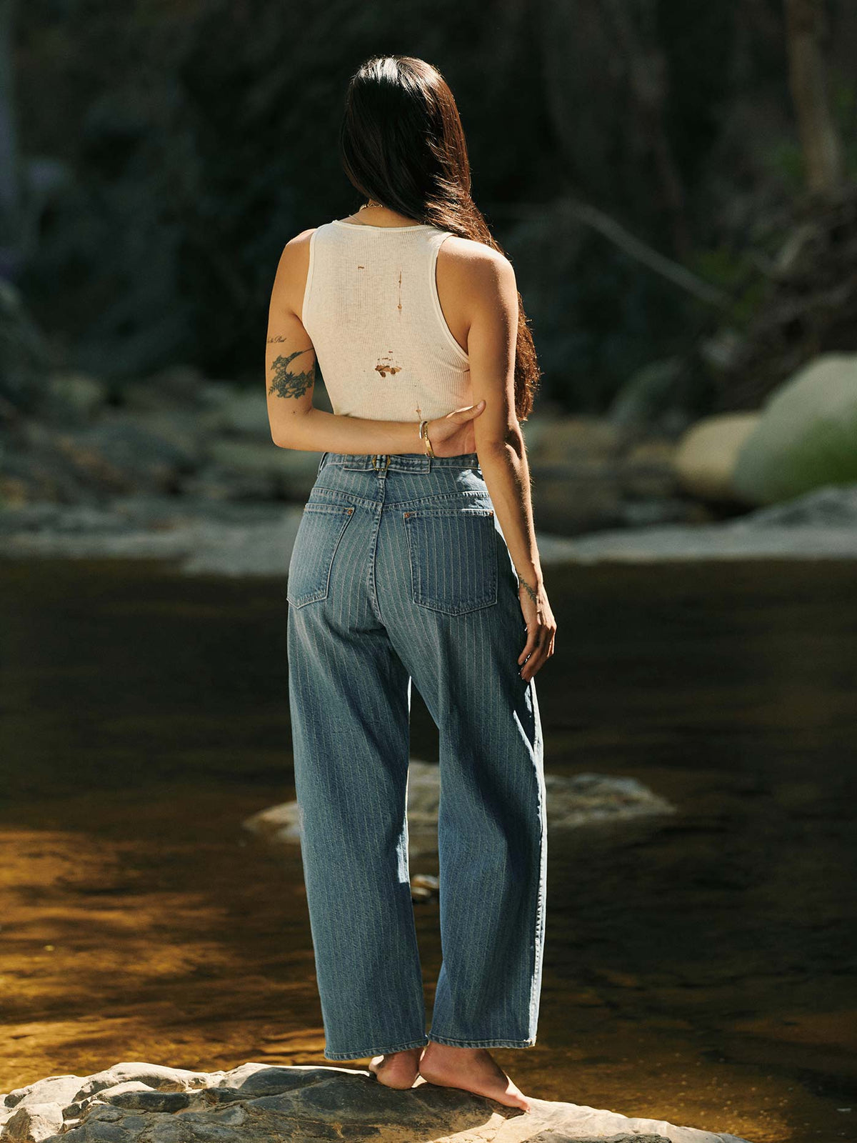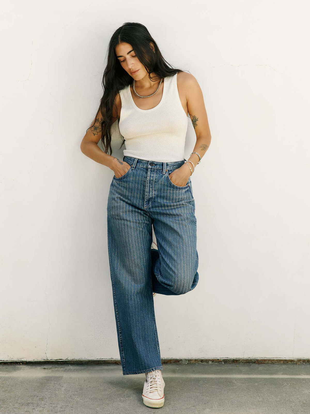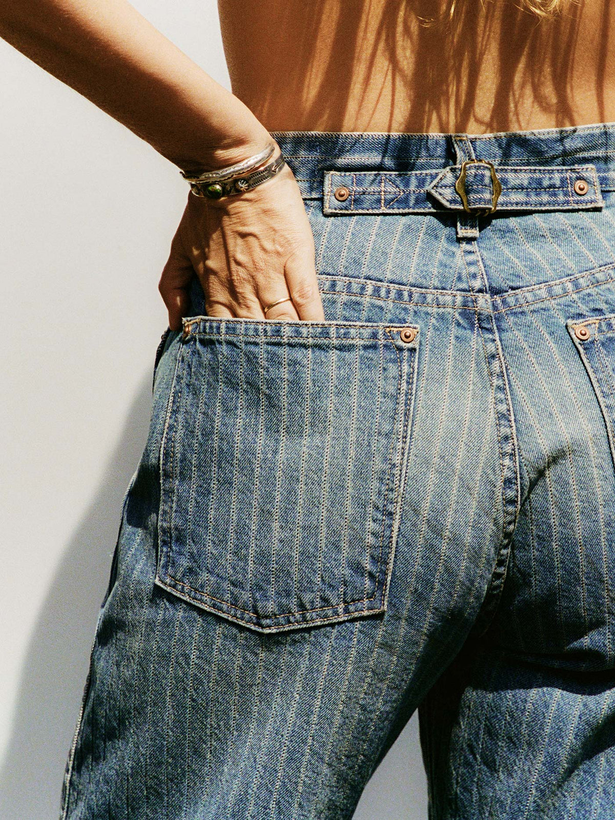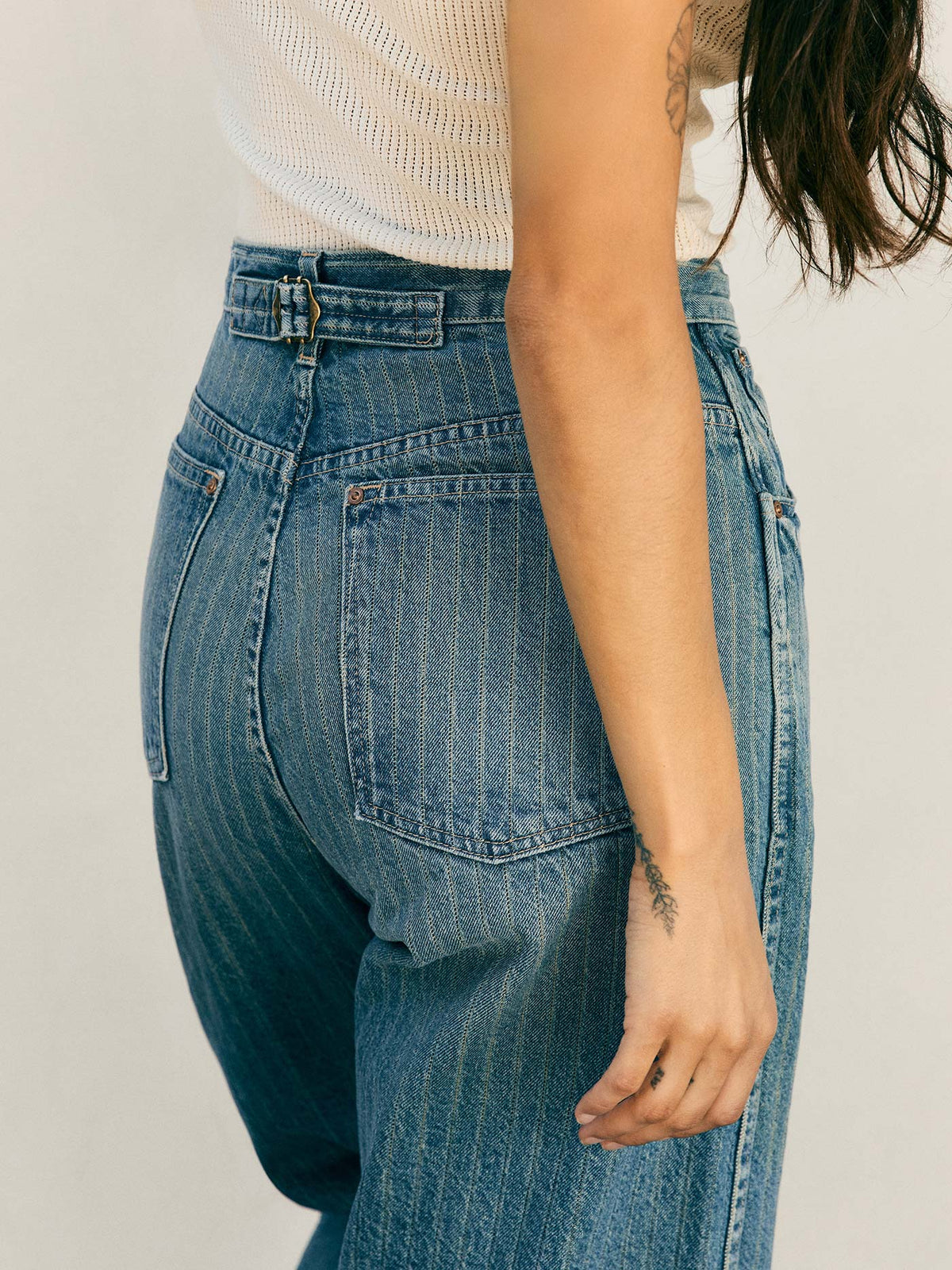 utilizing a high rise and an open, accommodating leg, we paired this new fit with a beautiful Japanese indigo stripe fabric, then finished things off with rivet details and a buckleback waist.
